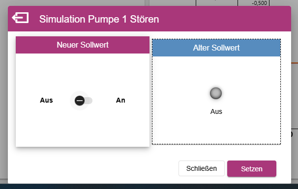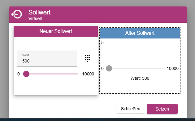 Für die Eingabe von Sollwerten in audako stehen Ihnen verschiedene Widgets zur Verfügung. Diese können Sie in Ihrem Dashboard einsetzen, um die Sollwerte Ihrer Anlage zu überwachen und zu steuern. Hierbei öffnet sich an den hierfür vorgegebenen Stellen ein Dialog, in welchem Sie den gewünschten Wert eingeben können. Die Sollwerteingabe kann sowohl für analoge, digitale als auch universelle Ausgangssignale erfolgen. Der Dialog zeigt Ihnen auf der rechten Seite den aktuellen Wert des Signals, auf der linken Seite können Sie den gewünschten Wert eingeben. Nachdem Sie den Wert eingegeben haben, bestätigen Sie diesen mit einem Klick auf den Button “Setzen”. Ihr Wert wurden nun gespeichert.