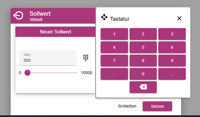 Im Falle eines Analogwertes können Sie den Wert direkt eingeben, mit dem Schieberegler einstellen oder über die Tastaturkomponente den Wert eingeben. Um die Tastaturkomponente zu öffnen, klicken Sie auf das Tastatursymbol hinter# dem Eingabefeld.
