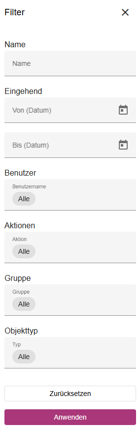 Nachdem Sie Ihre Filteroptionen konfiguriert haben, können Sie auf “Anwenden” klicken, um Ihre Änderungen für die Audit-Log-Liste zu übernehmen. Durch Betätigen des “Zurücksetzen”-Buttons können Sie Ihre Änderungen wieder rückgängig machen. Sie haben die Möglichkeit nach folgenden Kriterien zu filtern: