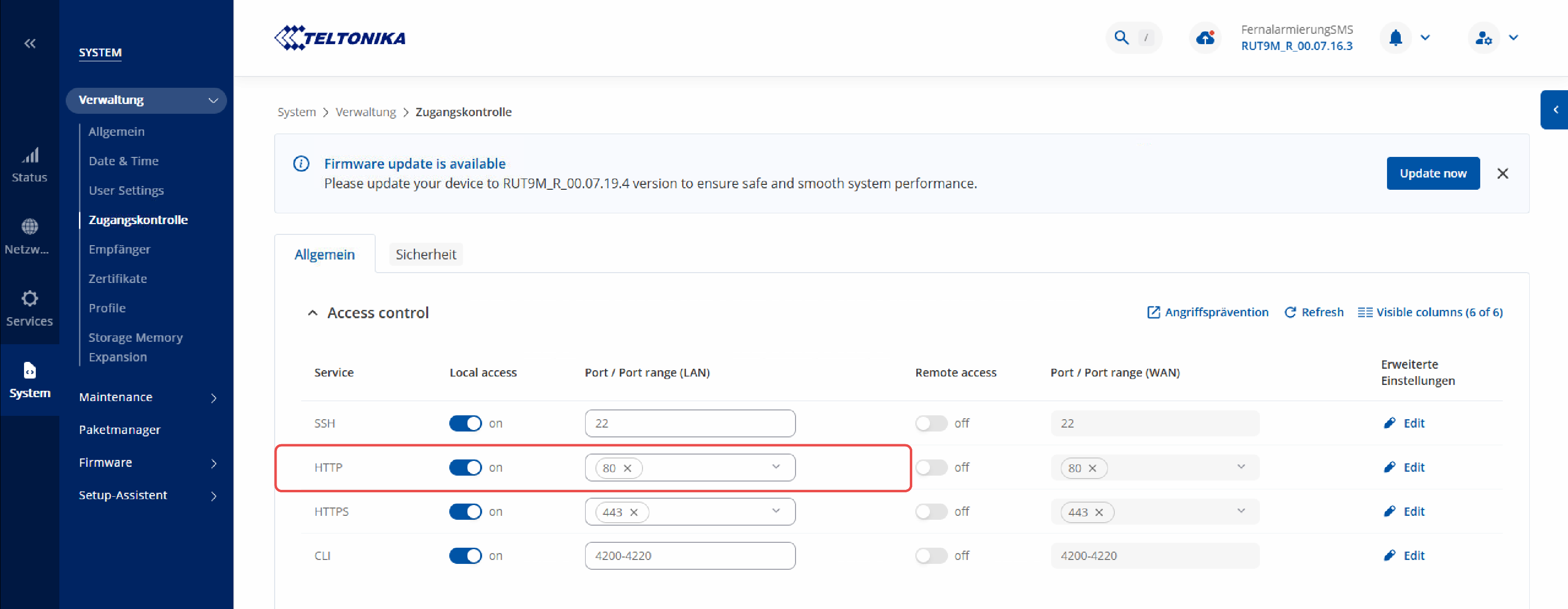 Navigieren Sie zu System -> Verwaltung -> Zugangskontrolle und stellen Sie sicher, dass die HTTP-Schnittstelle für lokalen Zugriff aktiviert ist: