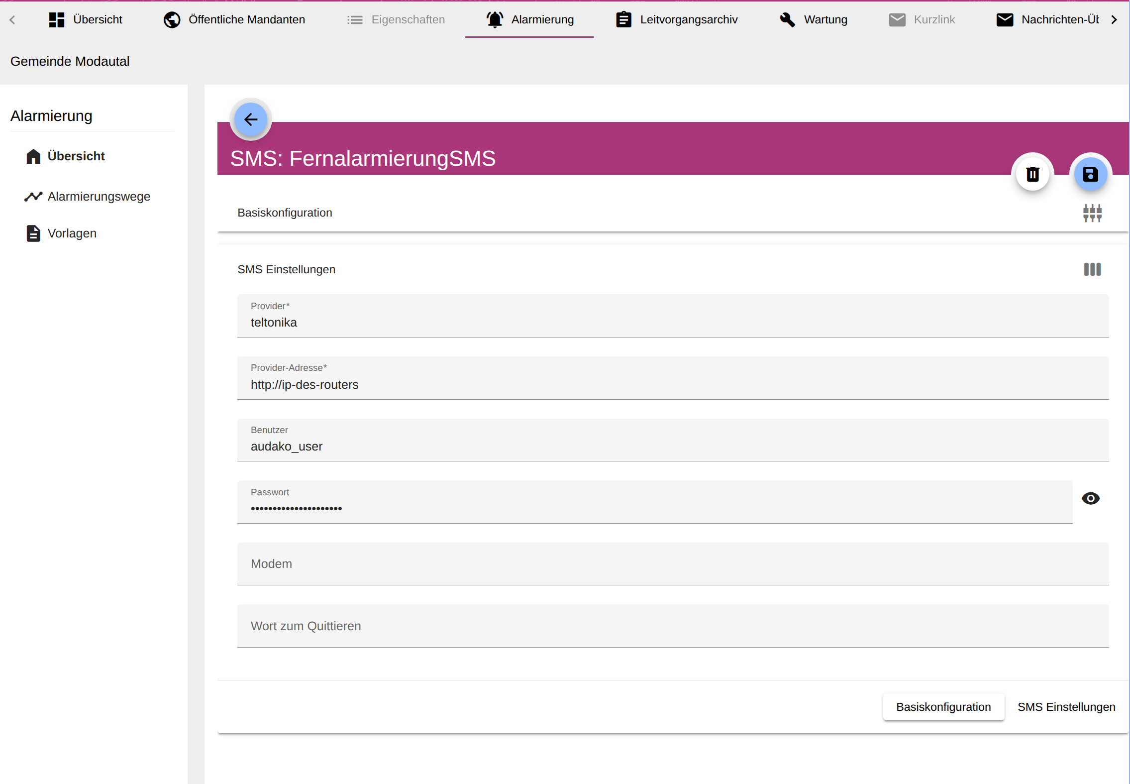 Öffnen Sie die audako Plattform und legen Sie in der Administration einen neuen SMS-Alamierungsweg an.