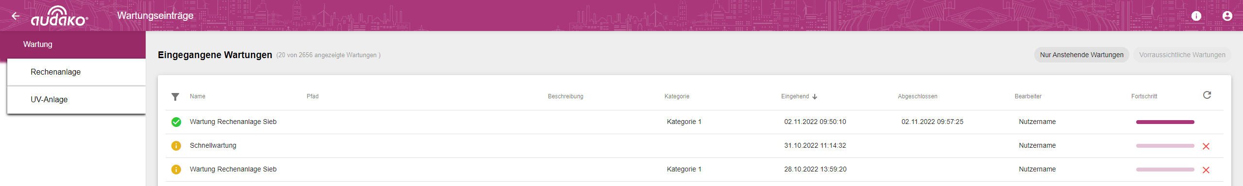 In „Wartungsaufträge“ können Sie alle eingegangene und bearbeitete Wartungen Ihres Mandanten sehen. Sie erhalten somit eine Übersicht des Wartungsfortschritt Ihrer Anlage.