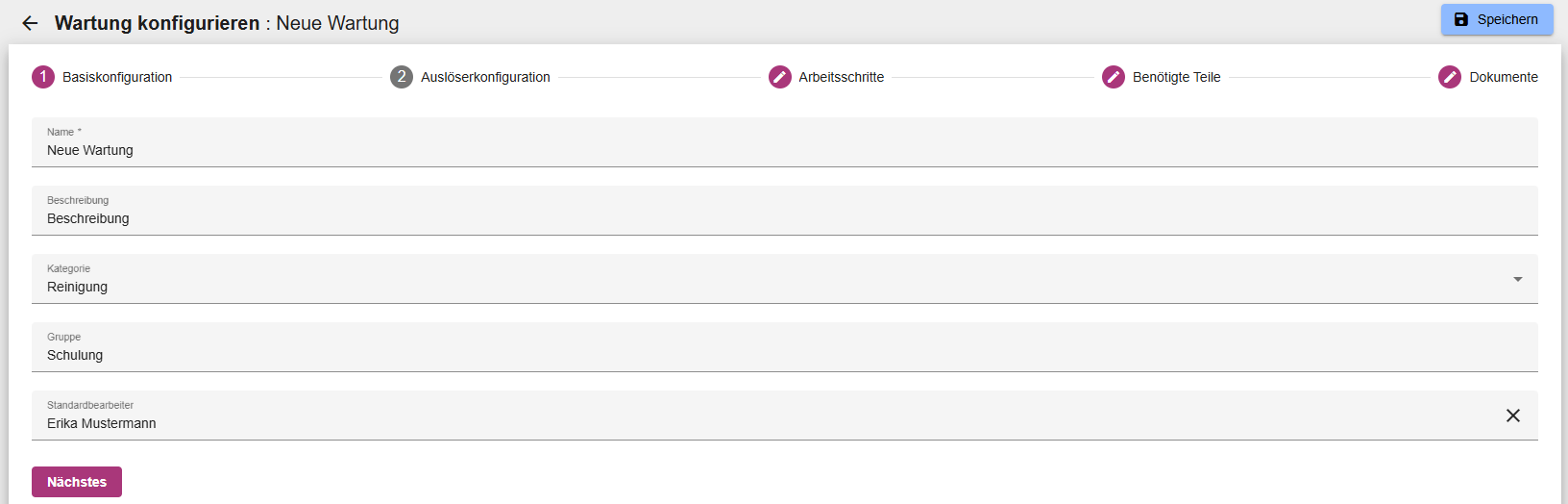 Nachdem Sie auf den Button geklickt haben, öffnet sich der Wartungskonfigurator. Geben Sie zunächst alle wichtigen Basisinformationen ein. Innerhalb der Basiskonfiguration können folgende Informationen eingetragen werden: