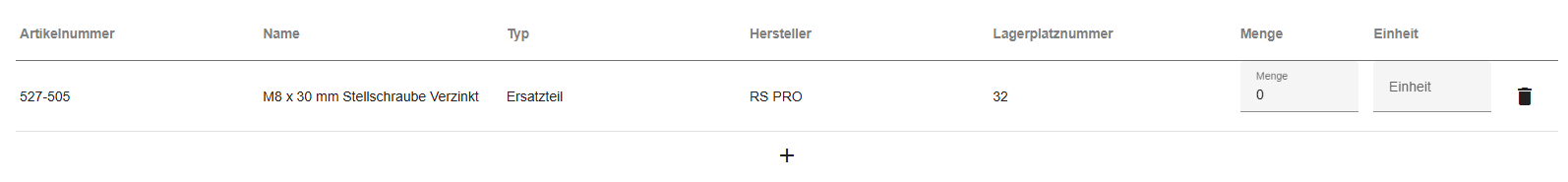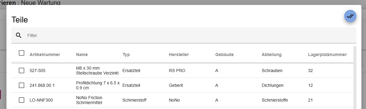 Innerhalb des reiters “Benötigte Teile” können Sie alle Teile, Werkzeuge, Hilfsmittel, etc. und deren Menge hinzufügen, die zur Durchführung der Wartung benötigt werden. Klicken Sie hierzu auf den Button “+” innerhalb der Tabelle. Es öffnet sich ein Dialog, in welchem die vorab erstellten Teile, Werkzeuge, Hilfsmittel, etc. ausgewählt werden können. Bestätigen Sie Ihre Auswahl, indem Sie auf den Button in der oberen rechten Ecke des Dialogs klicken. Die ausgewählten Elemente werden nun zu der Tabelle hinzugefügt. Über das “Mülltonnen”-Symbol können Sie Elemente entfernen.