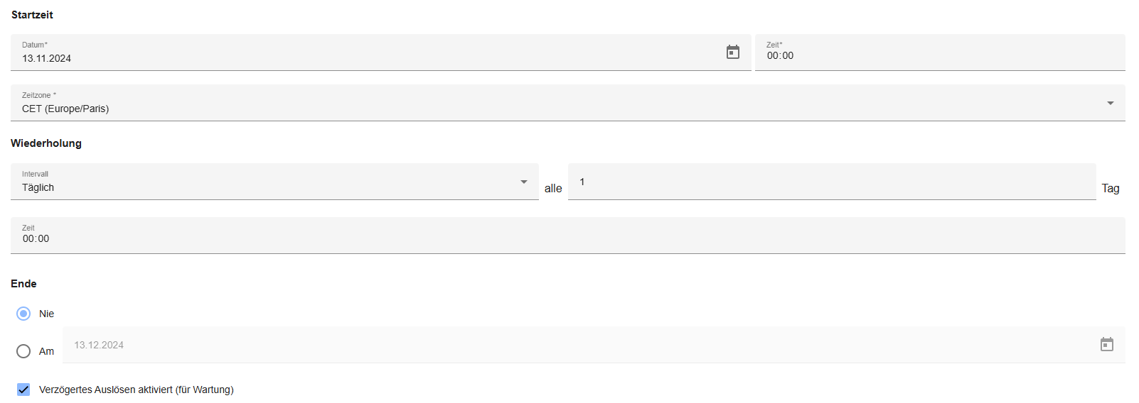 Ende: Hier können Sie das Enddatum der Wartung festlegen. Die Wartung wird nach dem Enddatum nicht mehr ausgelöst. Standardmäßig wird kein Enddatum festgelegt.