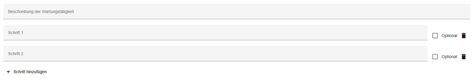 Innerhalb der Arbeitsschritte können Sie die Tätigkeit zunächst allgemein beschreiben. Und wichtige Informationen hinzufügen, tragen Sie hierzu die Beschreibung der Wartungstätigkeit ein. Des Weiteren können Sie die Tätigkeit in verschiedene Arbeitsschritte unterteilen. Klicken Sie hierzu auf den Button “+ Schritt hinzufügen”. Tragen Sie nun die Beschreibung des Arbeitsschrittes ein und legen Sie fest, ob dieser Arbeitsschritt optional ist. Optionale Arbeitsschritte müssen vom Bearbeiter nicht ausgeführt werden, um die Wartung abzuschließen. Über das “Mülltonnen”-Symbol können Sie Arbeitsschritte entfernen.