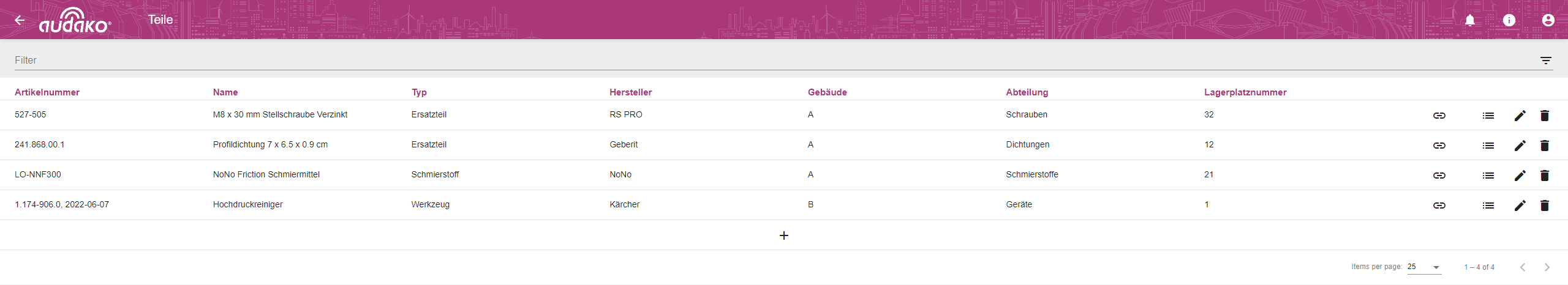 In „Teile“ finden Sie alle für den Mandanten zur Verfügung stehenden Teile, Hilfsstoffe und Werkzeuge mit den dazugehörigen Details, wie Artikelnummer, Name, Typ, Hersteller, Lagerplatz, Weblink und alle verknüpften Aufgaben. Verknüpfte Aufgaben, zeigt alle Wartungsaufgaben, für die das jeweilige Teil benötigt wird.